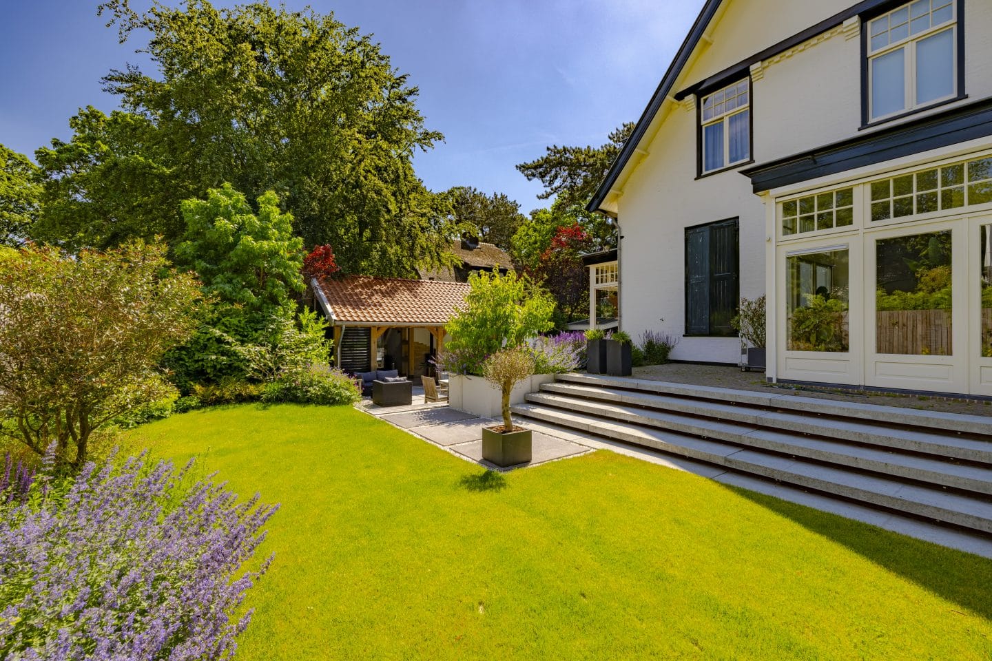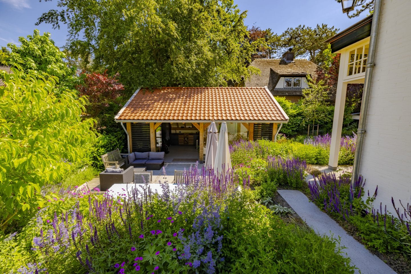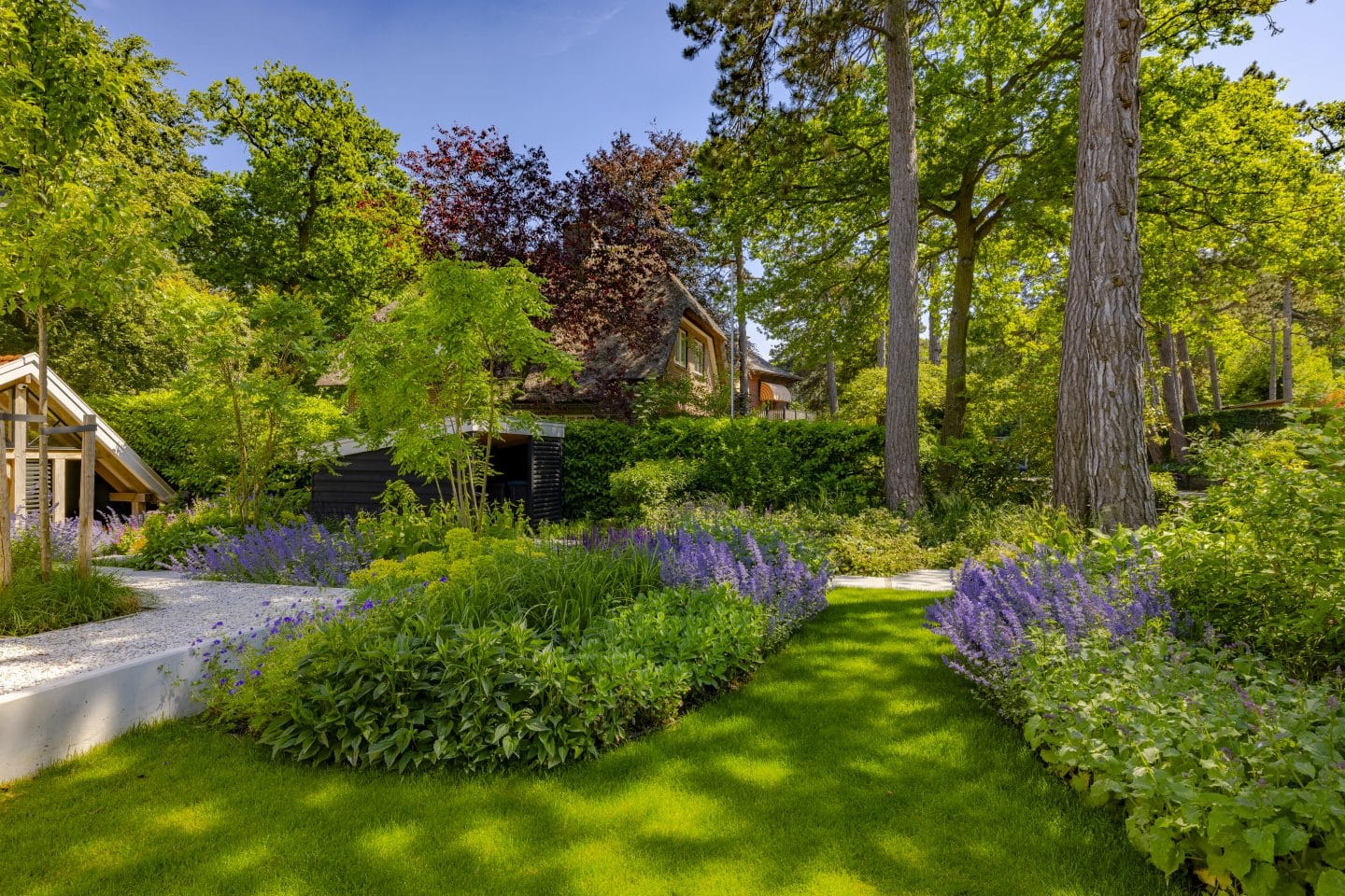 In deze tuin zaten behoorlijke hoogteverschillen. Dat wilden we benadrukken. Daarom kozen we ervoor het buitenverblijf lager neer te zetten dan de rest van de tuin, waardoor er nadruk op de diepte kwam. Diepte zorgt ervoor dat bepaalde delen worden ontsloten en een andere sfeer en dimensie krijgen. In de voorbereiding bestond het grondwerk uit het vrijgraven en ruimte maken voor de verschillende hoogteverschillen, wat voorzichtig moest gebeuren omdat het dicht lang het huis liep. De oprit verplaatsten we om de route naar de voordeur te benadrukken en de functionele ruimte in de tuin te vergroten.