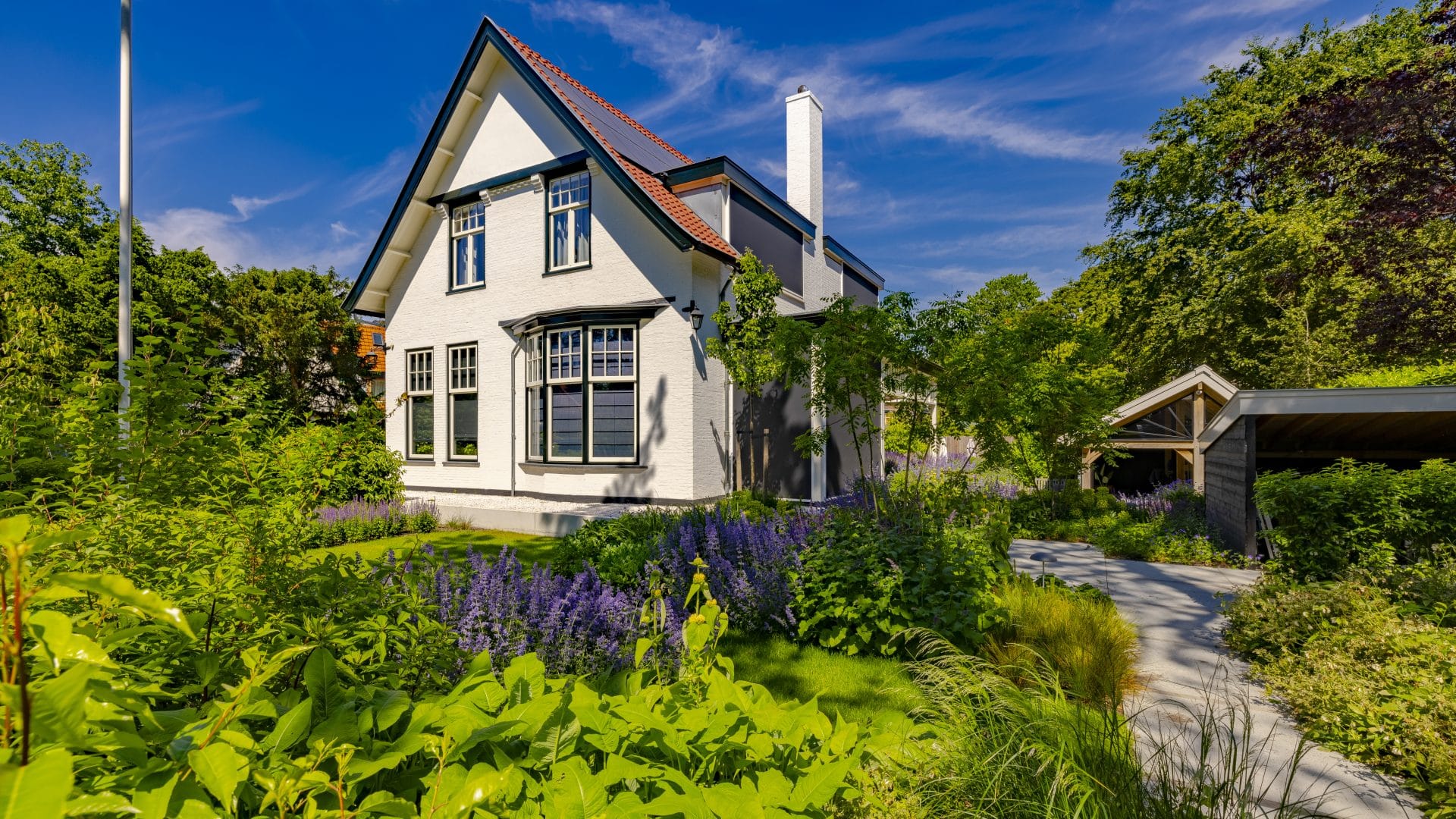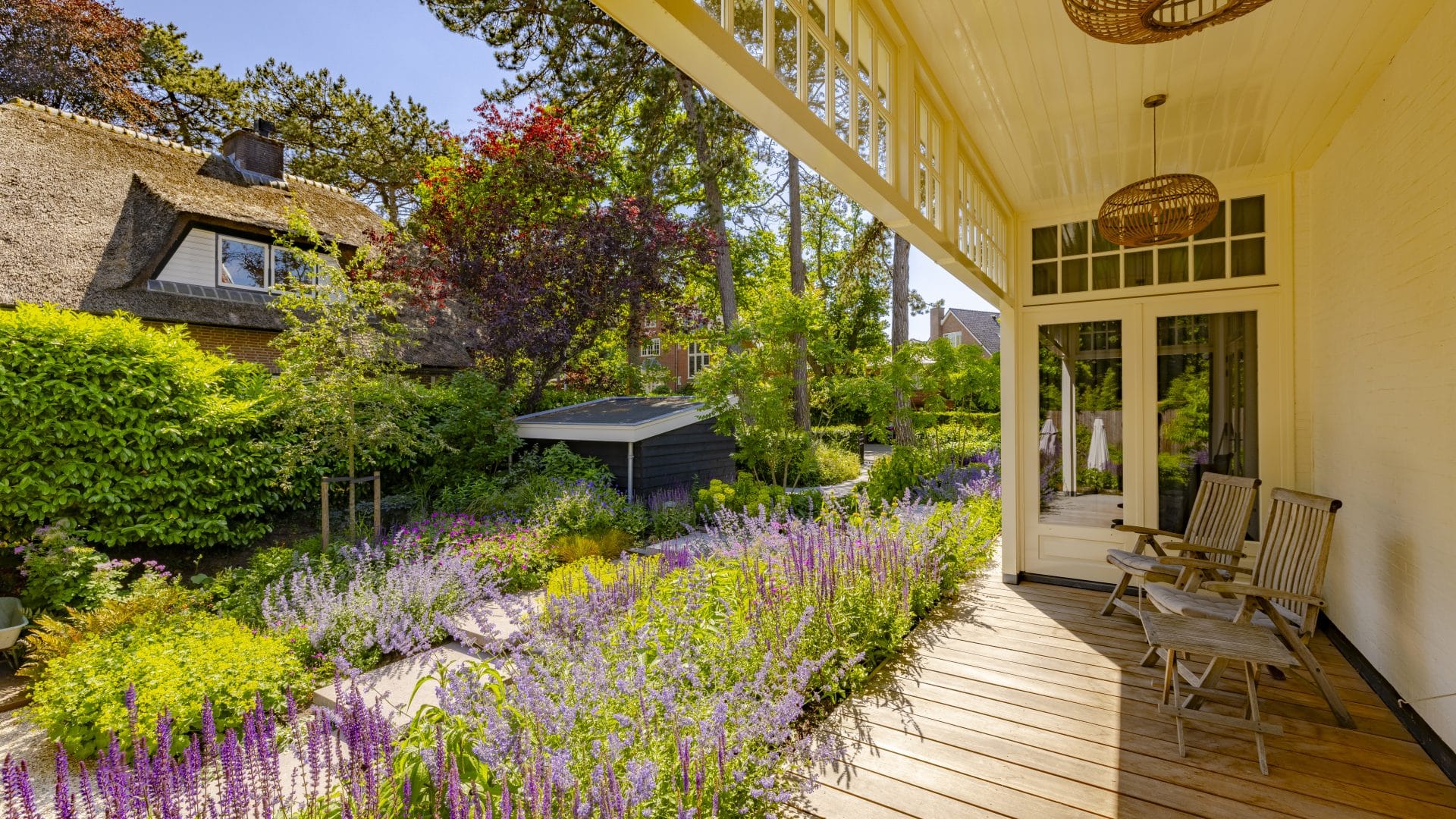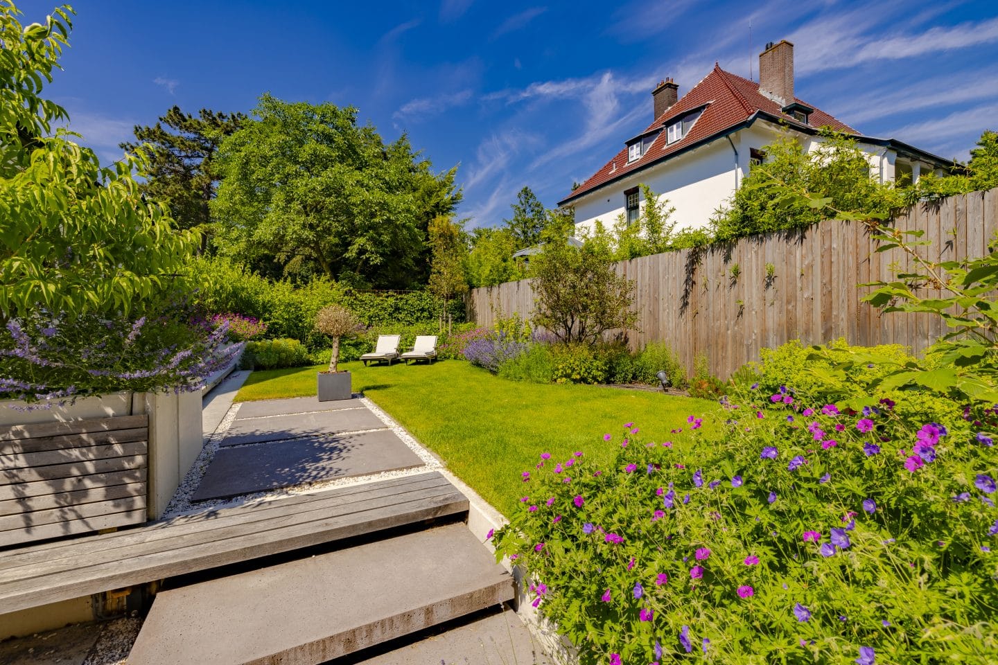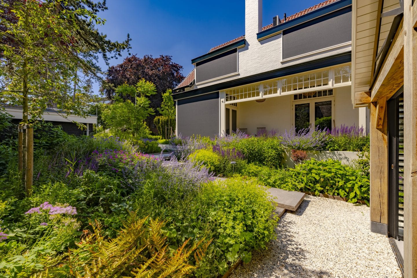 In het beplantingsplan kozen we voor een jaarrond bloeiende tuin, met veel groenblijvende planten en snelgroeiende weelderige borders met paarstinten en grassen. Aan de voorzijde plaatsten we twee meerstammige koelreuteria’s. Het is de bedoeling dat deze het zicht wegnemen vanaf de veranda. Ook zullen deze bomen, op het moment dat ze gaan groeien, elkaar raken. Daardoor ontstaat er een doorgang, die de verschillende delen van de tuin benadrukt en verbindt.