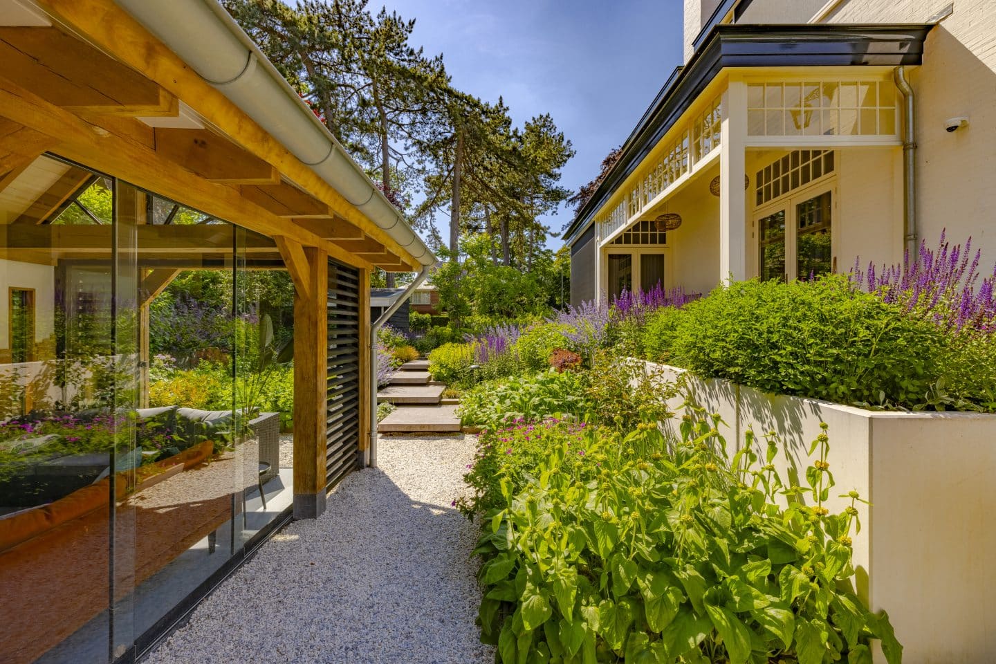 De wens was om een strakke en moderne bestrating te creëren met een knipoog naar het verleden. Dat realiseerden we door hout, grind, klinkers en betonplaten te combineren. Hergebruik was belangrijk, vandaar dat we de bestaande klinkers hebben hergebruikt voor het terras en de oprit. Onder de betonnen aantrede van de trap verwerkten we houten balken, wat zorgt voor een karakteristiek effect. Het hoogteverschil konden we op veel plekken opvangen met hout en ook tussen de grote vierkante tegels plaatsten we hout. Dit zal na verloop van tijd donkerder van kleur worden, waardoor de tegels een zachtere uitstraling krijgen. Door hier en daar een zachte tint grind toe te voegen, krijgt de bestrating een vriendelijke uitstraling die mooi overloopt in de woning.