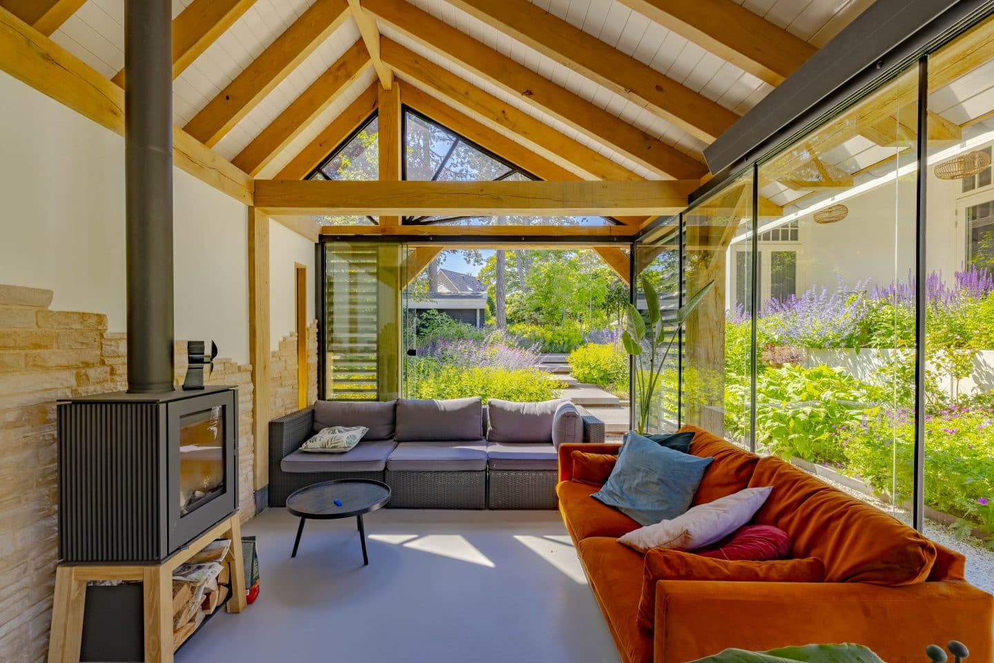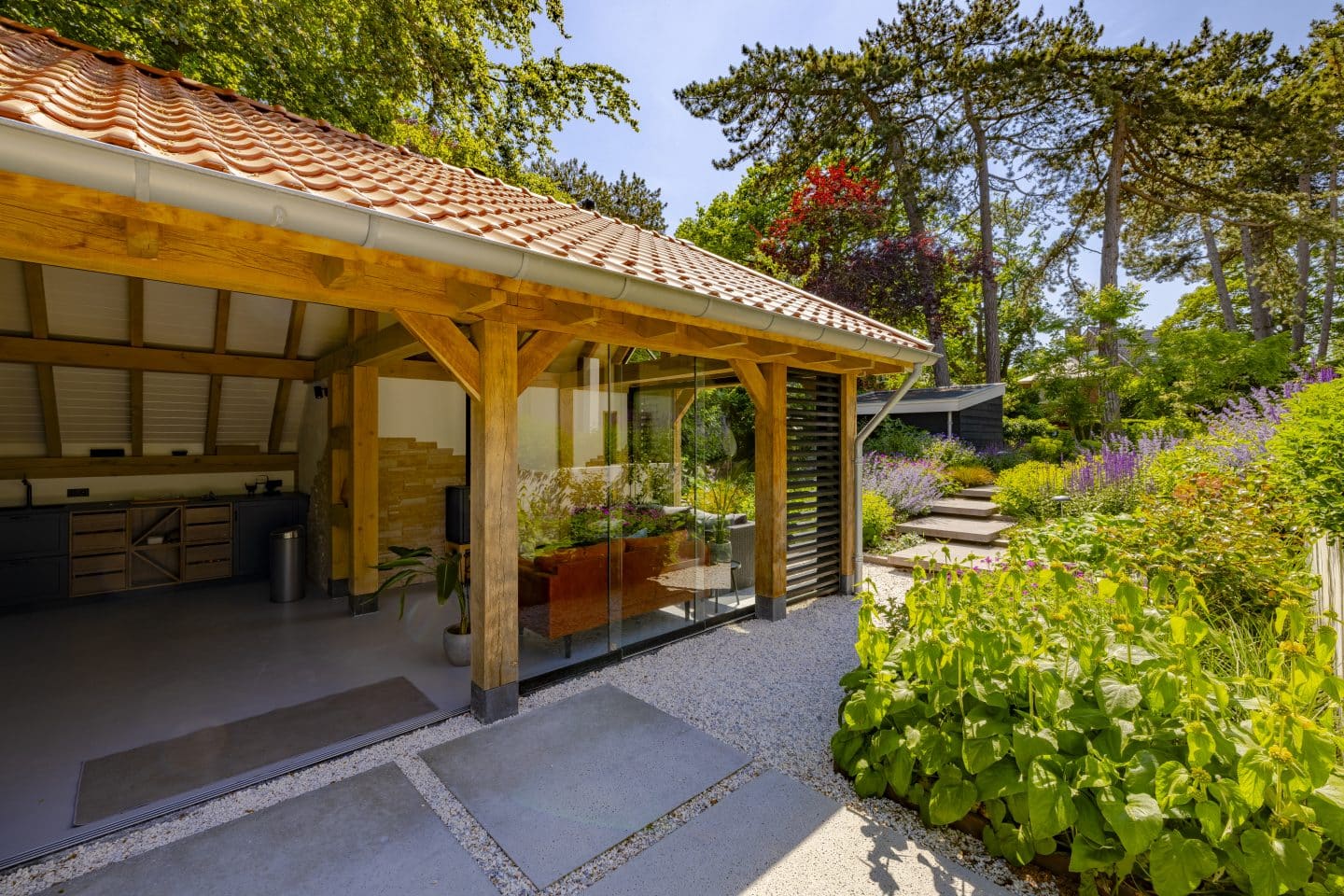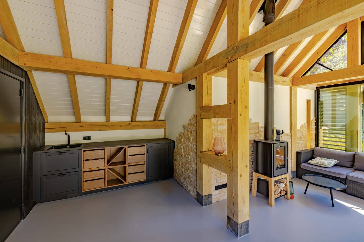 We realiseerden een groot en luxe buitenverblijf van eikenhout dat van alle gemakken is voorzien. Zoals een keuken, toilet en internetaansluiting. De glazen wand kan volledig open en dicht worden geschoven, waardoor dit verblijf het hele jaar rond te gebruiken is. In het timmerwerk zitten mooie houtverbindingen en op de gestucte achterwand verwerkten we steenstrips die zorgen voor een speels en authentiek effect. De hoogte is extra benadrukt door de schuine kap en houten balken.