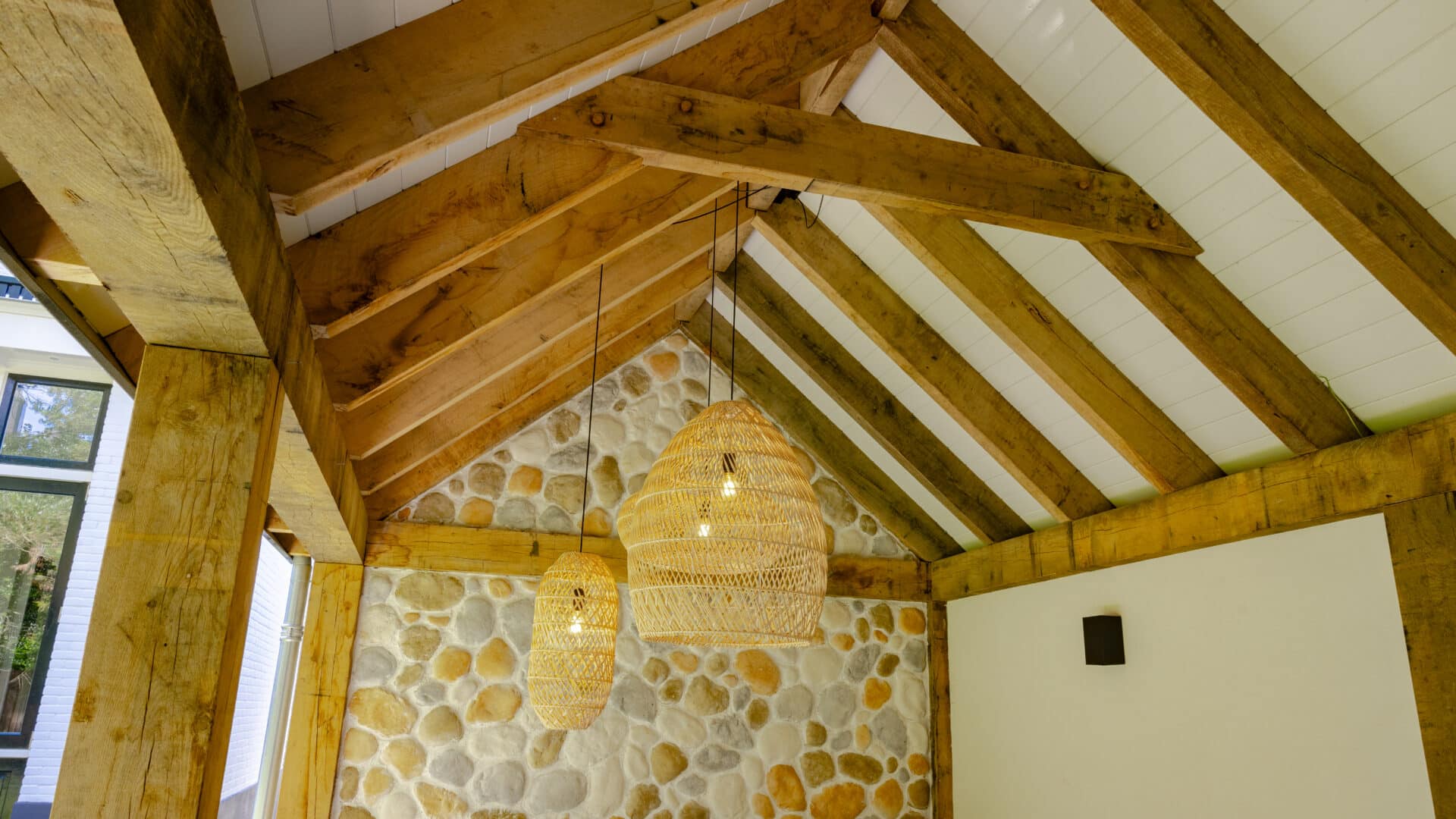 De bestaande oude bomen zijn zorgvuldig verwijderd, waardoor er ruimte is gecreëerd voor een nieuwe sfeer. In de achtertuin prijkt nu een elegant buitenverblijf, opgetrokken uit eikenbalken, met zowel een haard voor gezellige avonden als ruimte voor opslag. Dit ruime toevluchtsoord biedt niet alleen comfort voor het gezin, maar fungeert ook als een plek voor de kinderen en hun vrienden om samen te komen zonder in het zicht van binnen te zijn.