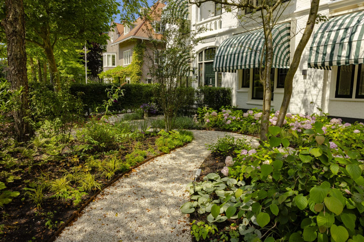 Bij de entree is een speelse oprit aangelegd, waarbij castle grind en gezaagde kinderkoppen in beige tinten samenkomen. Deze keuze is niet alleen erg mooi, maar voorkomt ook dat grind op de straat komt te liggen. Het ontwerp zorgt voor een romantische uitstraling en behoudt de overgang tussen de ruwe elementen in de natuur en de gestructureerde indeling van de tuin.