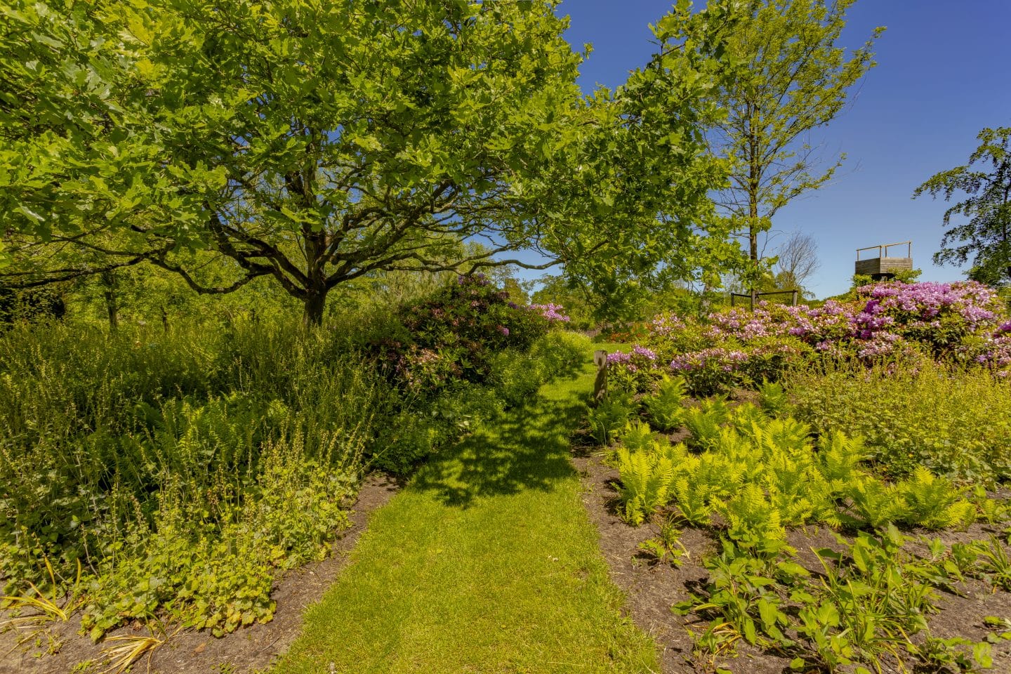We verzorgden het ontwerp en de aanleg van de hele buitenrand en het gazon. In het beplantingsplan kozen we voor een grote tamme kastanjeboom in het midden. Met als reden dat de tuin zich bevindt in een zogenoemde landgoederenzone. Op de buitenplaatsen in die zone zijn vaak tamme kastanjebomen te zien, net als rododendrons en varens. Ook deze twee plantensoorten hebben we een plek gegeven. Omdat dicht bij de tuin een fietspad loopt en privacy een grote wens was, plaatsen we de borders een flink stuk hoger, zodat het zicht vanaf het fietspad beperkt wordt.