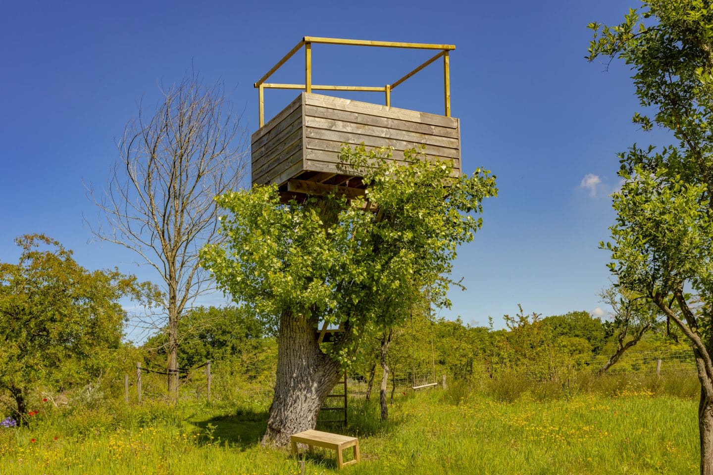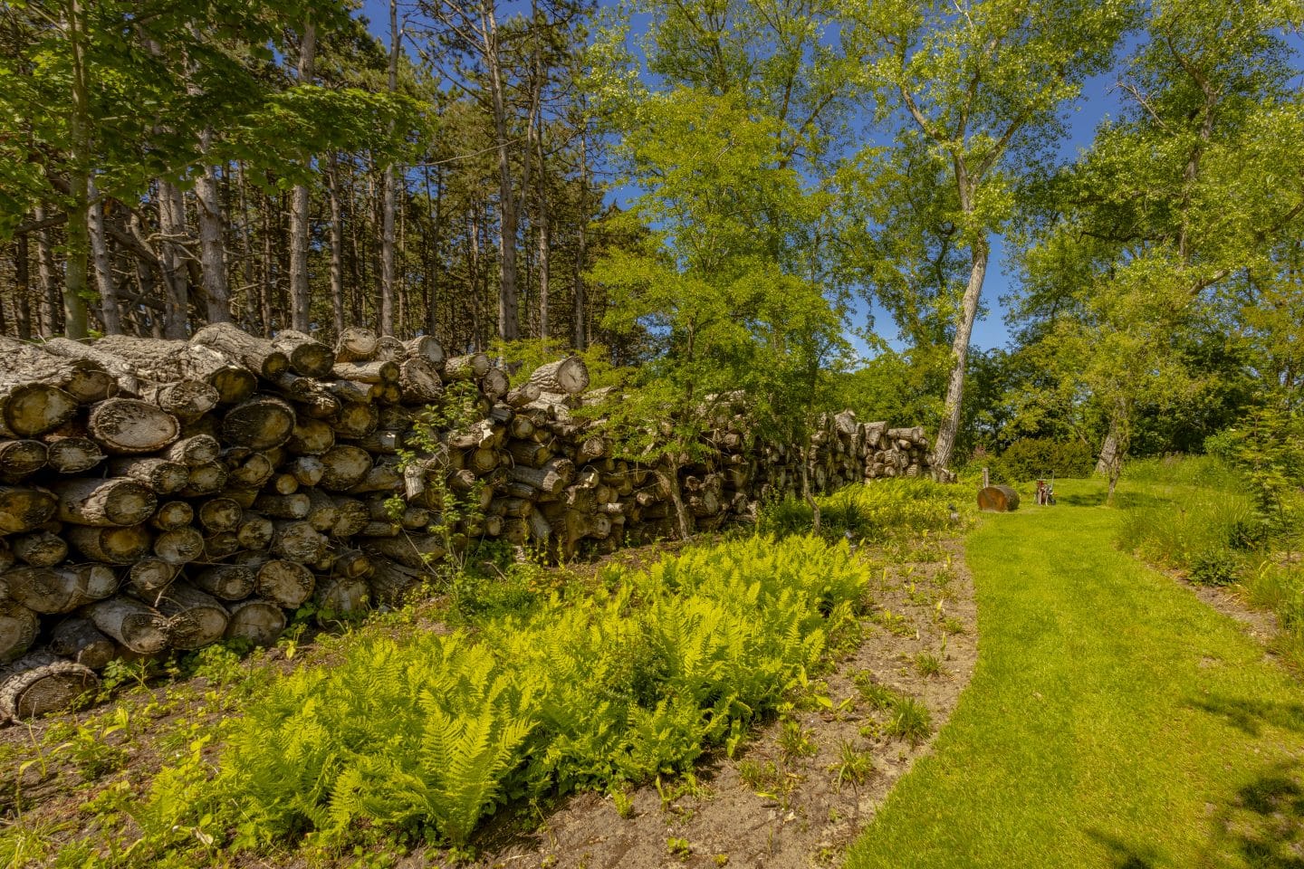 Rondom het landgoed gebruikten we boomstammen als een natuurlijke erfafscheiding. Bij de vuurplaats realiseerden we van hout vier royale banken en als afscheiding maakten we daarachter een houten schutting. Langs het pad brachten we speciale verlichting aan. Deze duurzame houten verlichting geeft voldoende licht zonder storend te zijn voor de vleermuizen en andere nachtdieren.