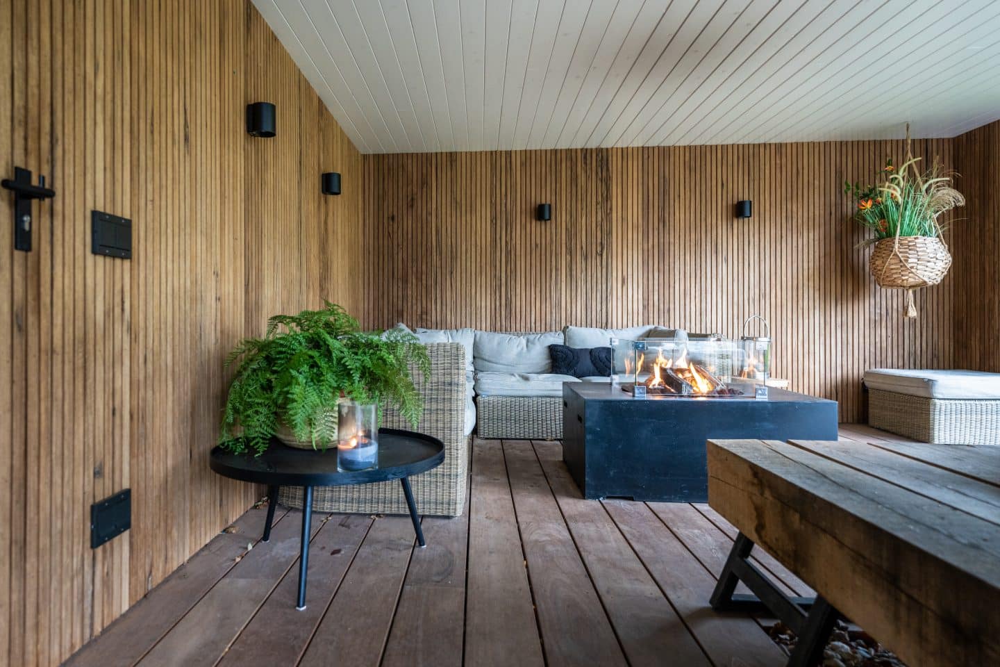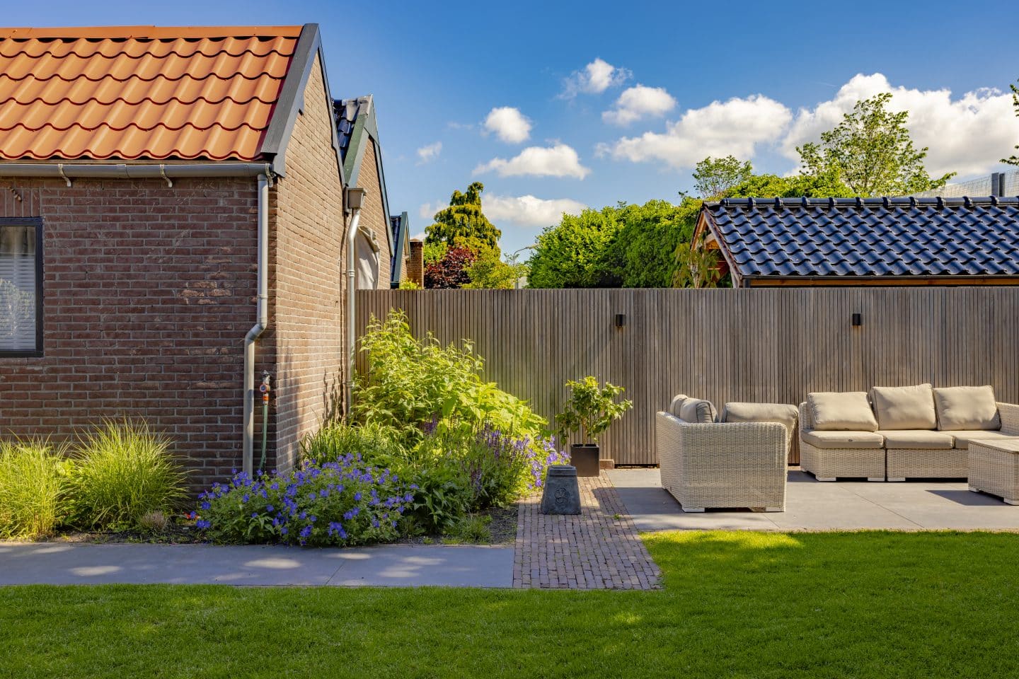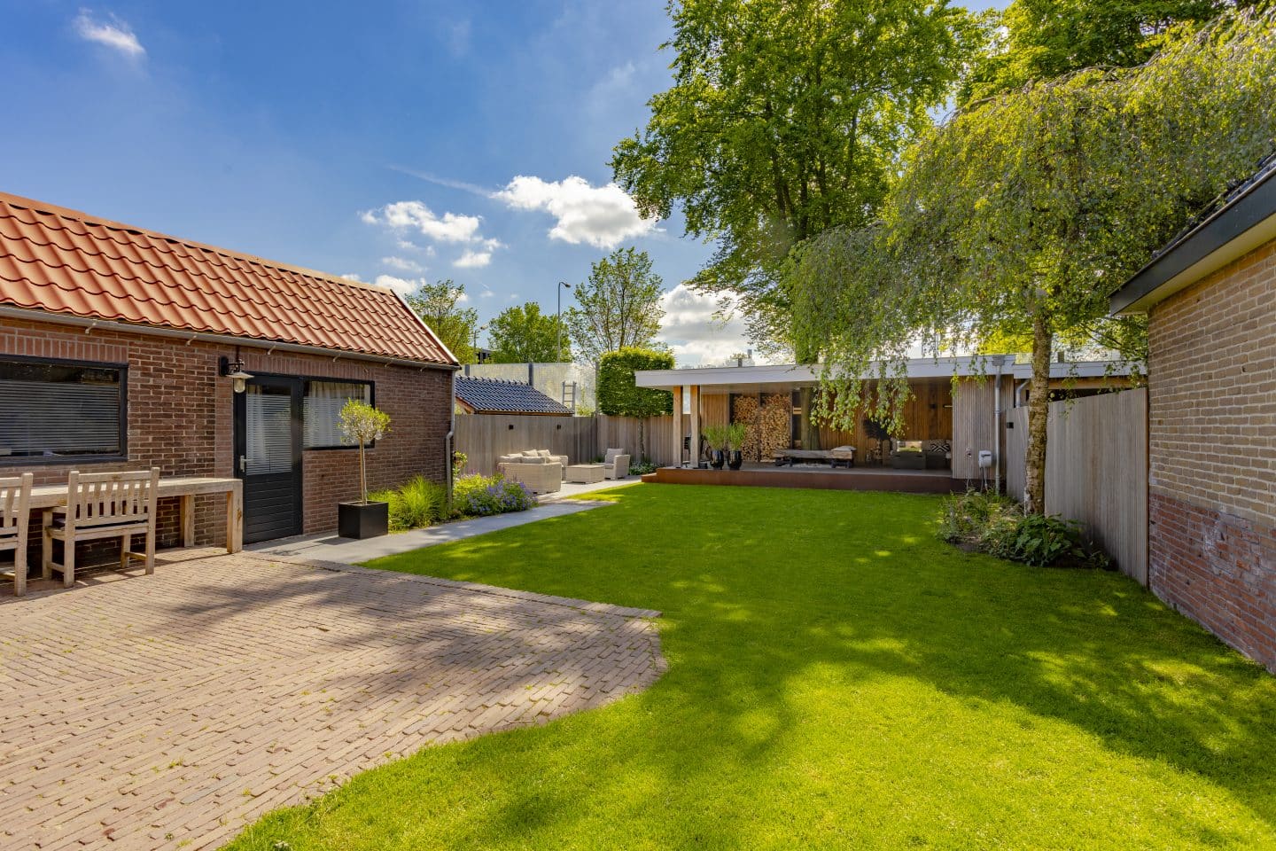 Voor een eigentijds effect kozen we in de bestrating voor een grote tegel in combinatie met klinkers. De aanwezige klinkers konden we hergebruiken en combineren met nieuwe keramische tegels en een houten vlonder bij de overkapping. Dezelfde klinkers gebruikten we ook in de voortuin, waardoor een mooie eenheid is ontstaan.