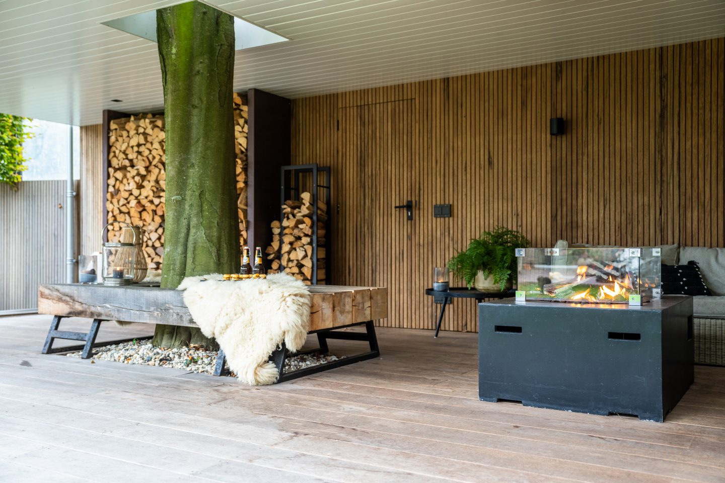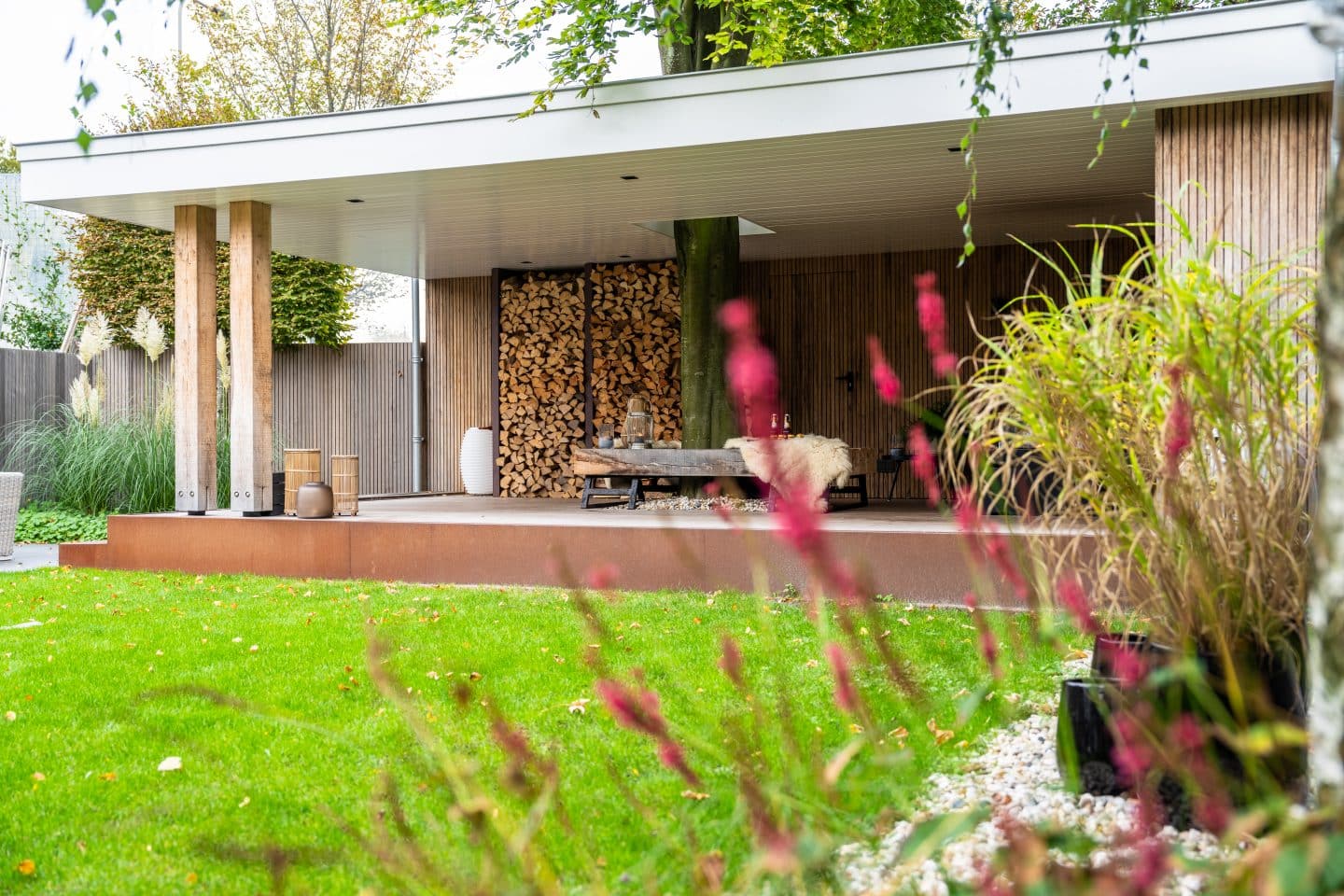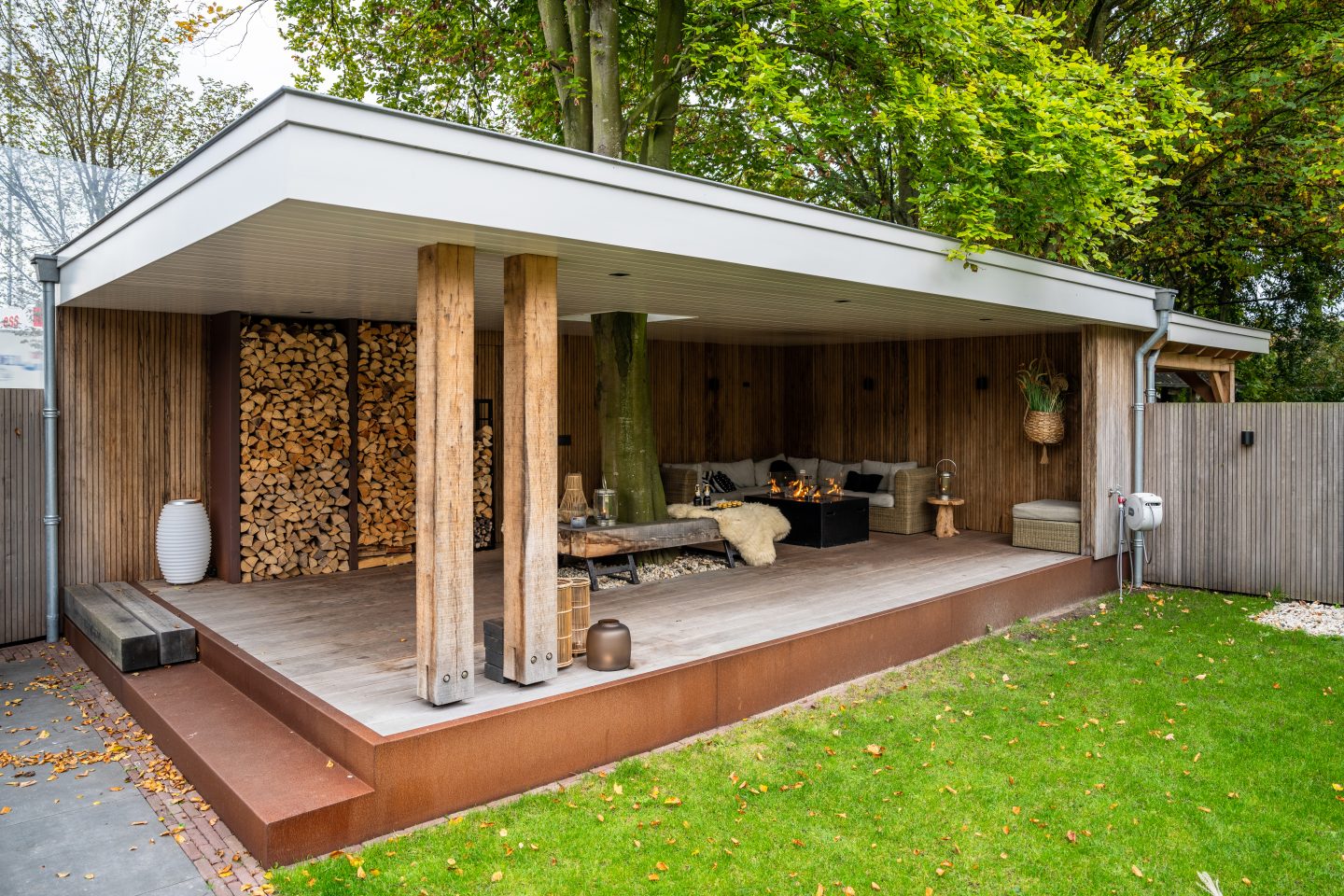 Achterin de tuin realiseerden we een unieke veranda. Een overkapping met stalen constructie, waarbij we de boom integreerde in het dak. De achterwand maakten we van frakéhout met trippelprofiel, de balken zijn van eikenhout wat ook weer terugkomt in het bankje aan de zijkant. Van hetzelfde hout maakten we de bank rondom de boom, waardoor een leuke zithoek is ontstaan. Bijna aan het zicht onttrokken maakten we achter de veranda een schuur, die te bereiken is via een deur in de achterwand van de veranda. Zo is op relatief eenvoudige manier snel extra opslagruimte ontstaan.
