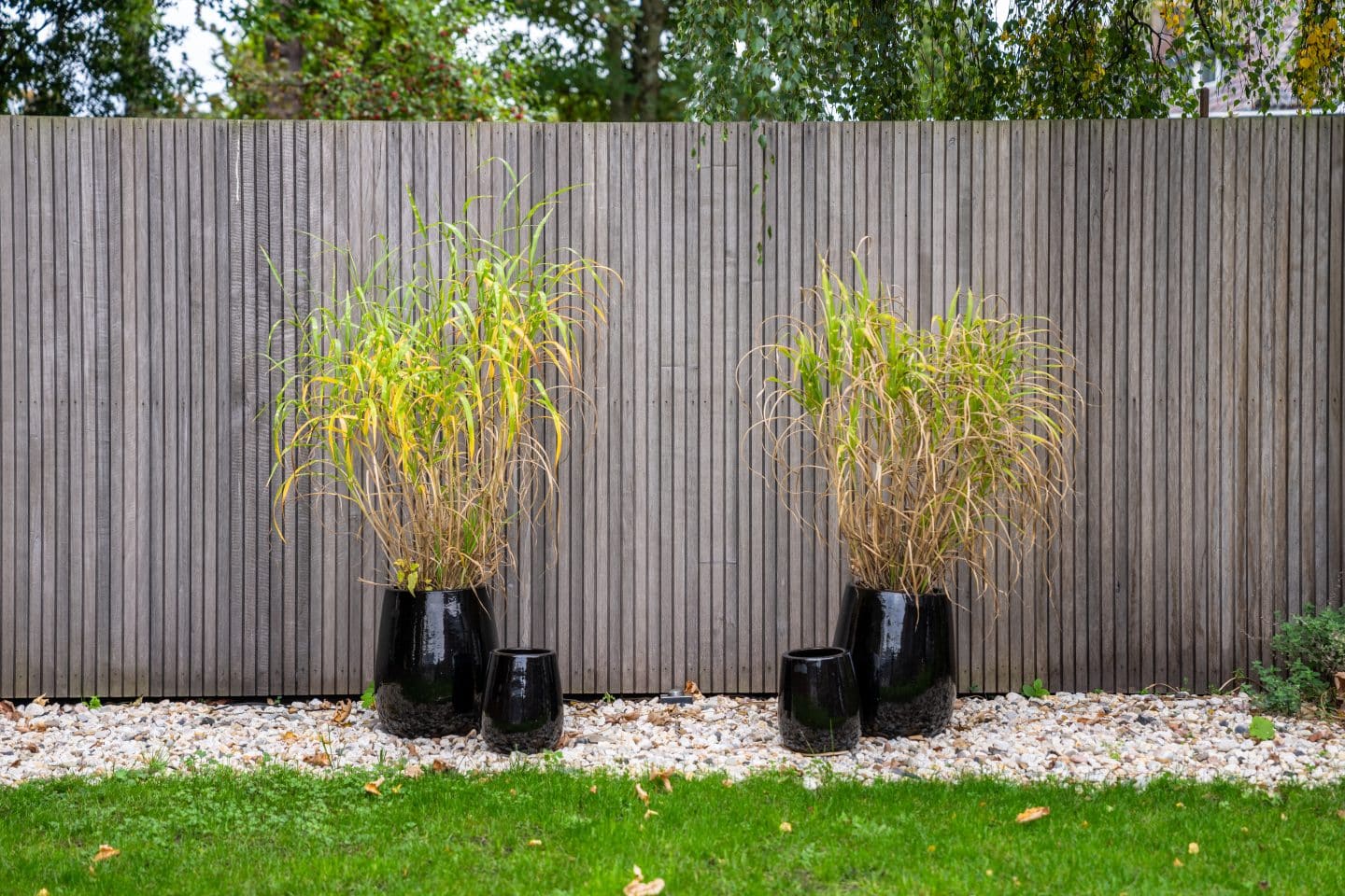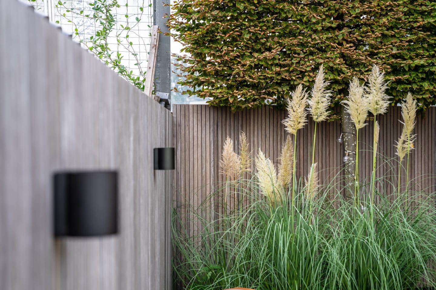 In het beplantingsplan kozen we voor een fraaie leiboom van bladhoudende beuk, die in de loop van tijd het zicht op de geluidswand zal ontnemen. De boom combineert fraai met de geraniums en siergrassen. Verder is gekozen voor onderhoudsvriendelijke beplanting in rustige tinten paars, roze en wit.