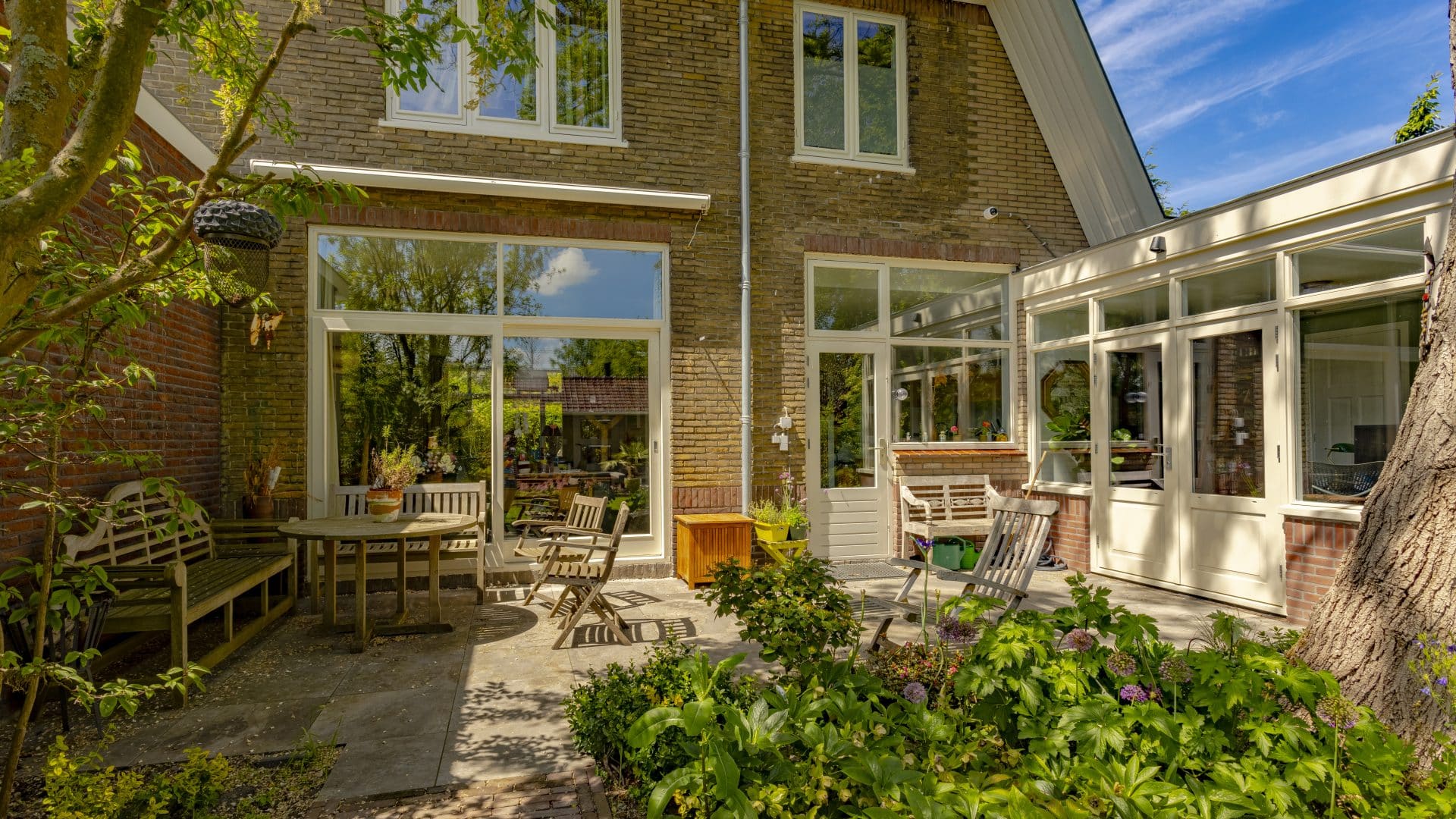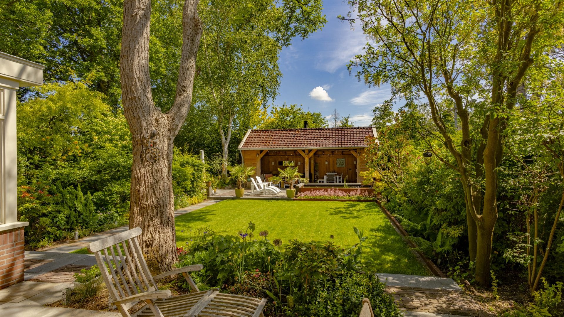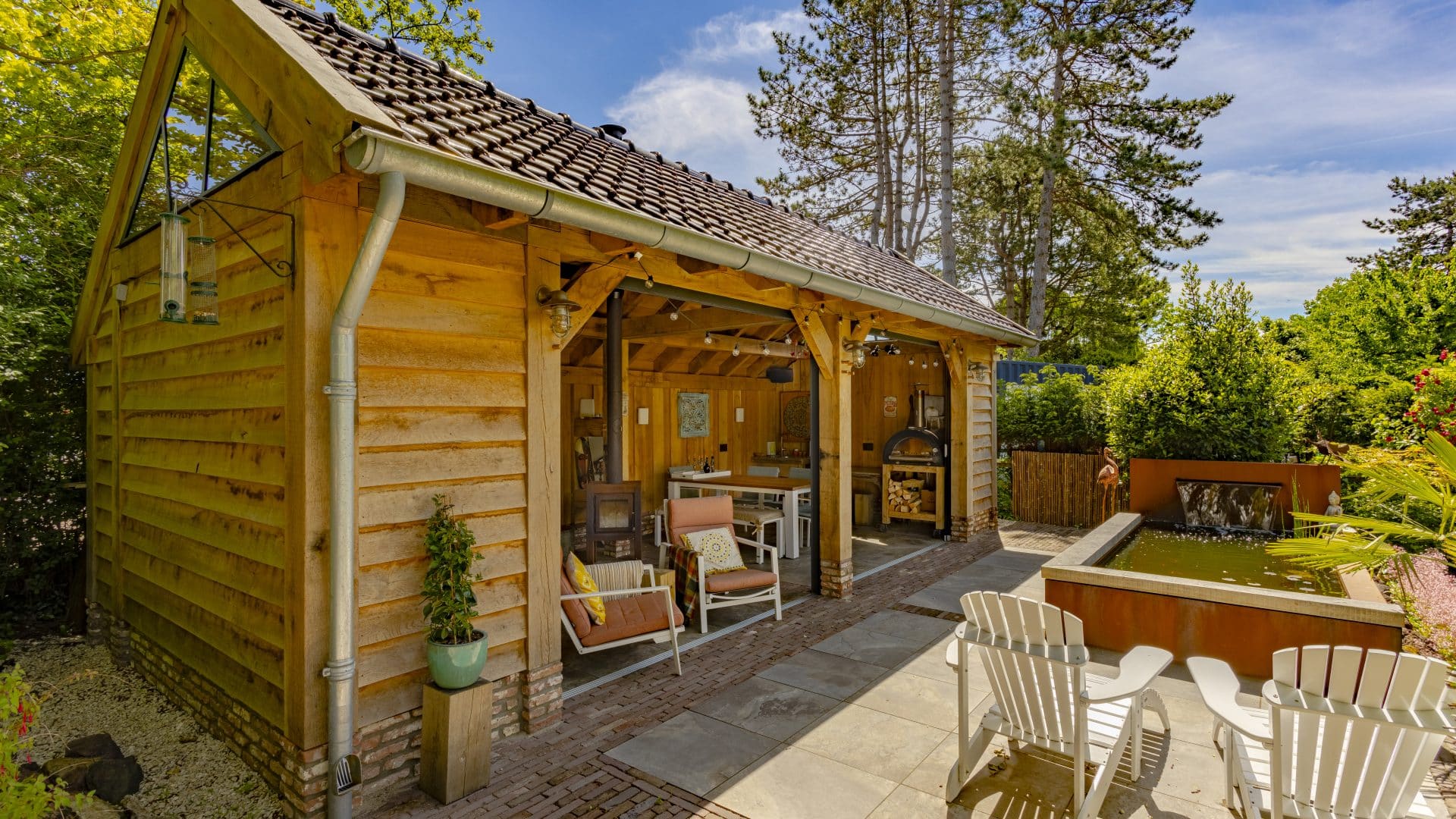In nauwe samenwerking met de klant realiseerden we een bijzonder buitenverblijf waar geen schroef aan te pas is gekomen. Alle verbindingen zijn met hout vastgezet. De overkapping is van eikenhout en voorzien van pen-en-gat verbindingen. Door de glazen schuifwanden is het buitenverblijf het hele jaar te gebruiken. Het heeft een ouderwetse uitstraling, maar is voorzien van vele gemakken en moderne technologie, waaronder internet, een muziekinstallatie en pizzaoven. Het is daarmee een verlengstuk van de woning geworden.
