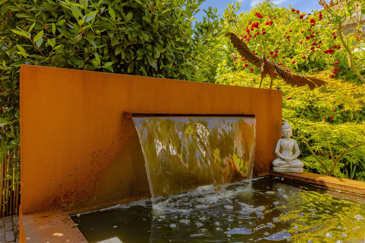 Deze tuin vraagt niet al te veel onderhoud. Dat geldt ook voor de vijver. Bij het ontwerp en de aanleg hielden we hiermee rekening, door voldoende diepte te realiseren die snelle algengroei voorkomt. Het watervalletje in de vijver is zowel esthetisch als functioneel; de beweging voegt zuurstof toe aan het water en bestrijdt algengroei.
