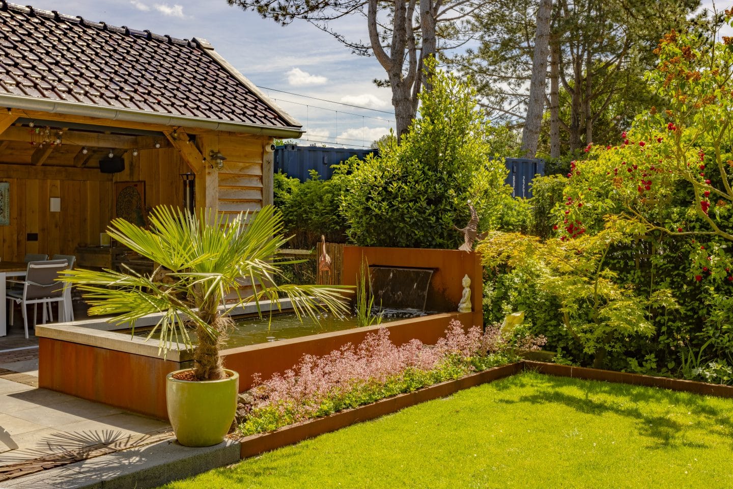 Voor de bestrating zochten we naar oude materialen, vanwege het sfeervolle uiterlijk. De klinkers konden we hergebruiken en combineren en moderne grijze tegels. Voor voldoende afwisseling in de bestrating realiseerden we een royale vijver. Het materiaal van de vijver, cortenstaal, komt terug in de kachel in het buitenverblijf en de randen van de borders.