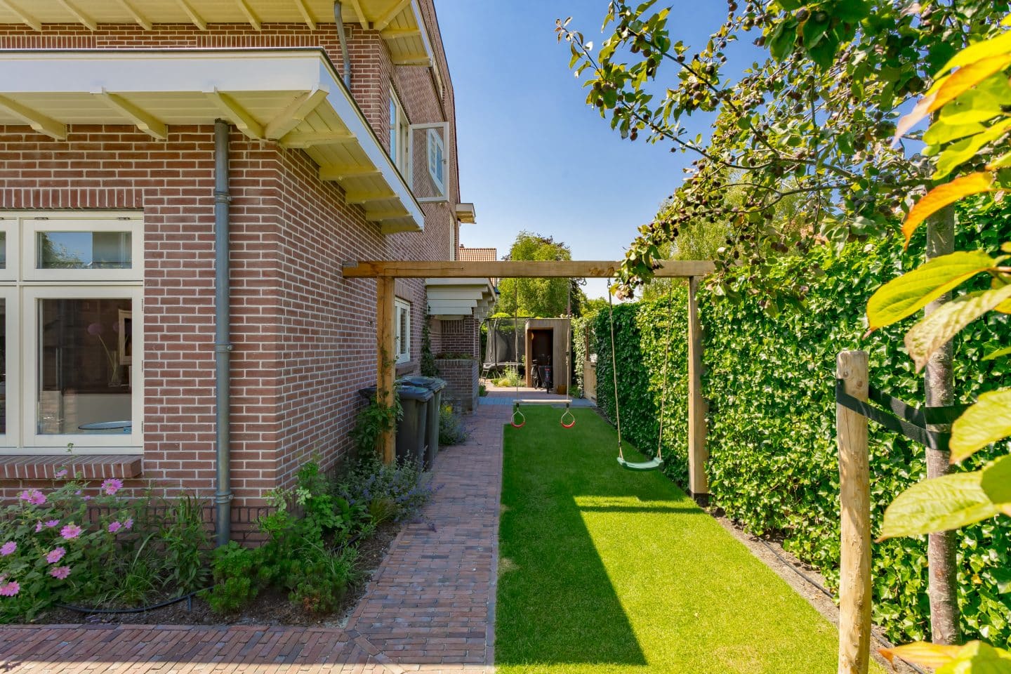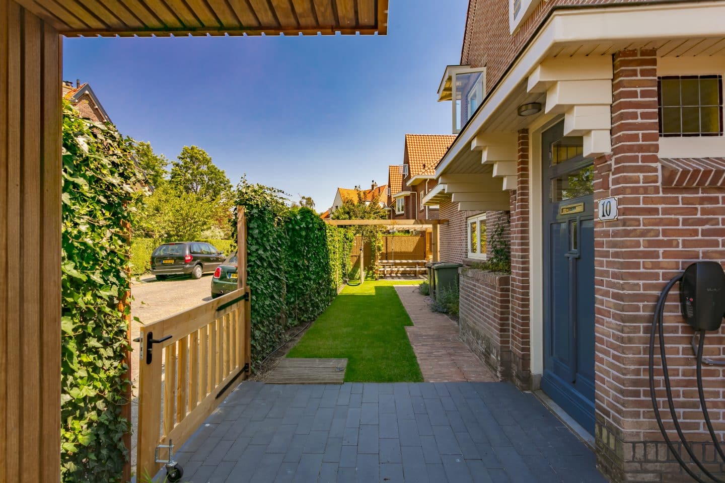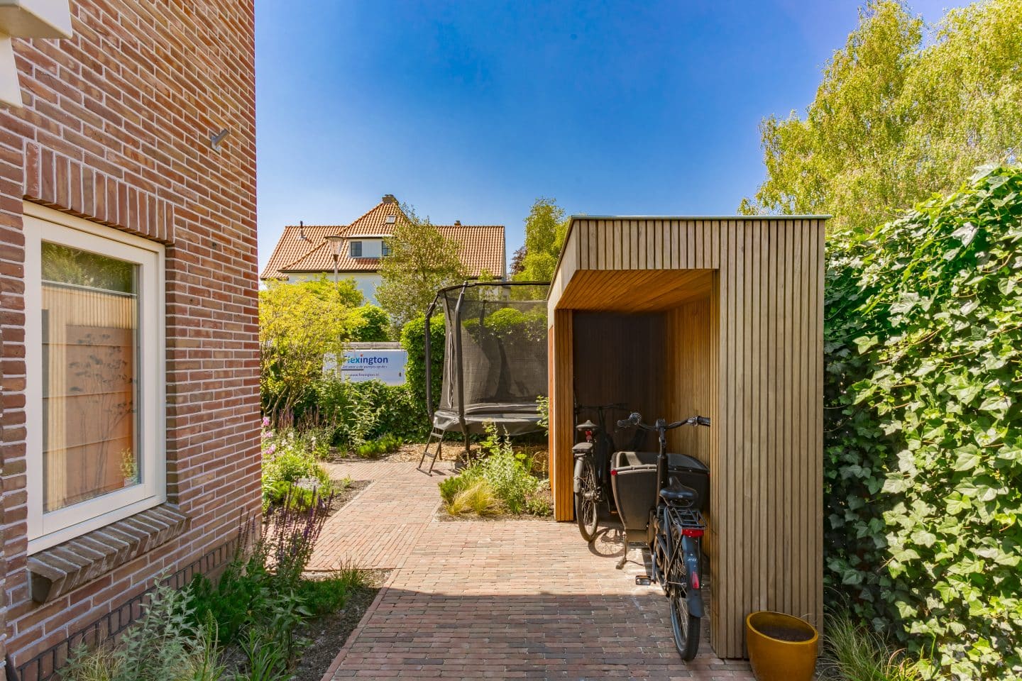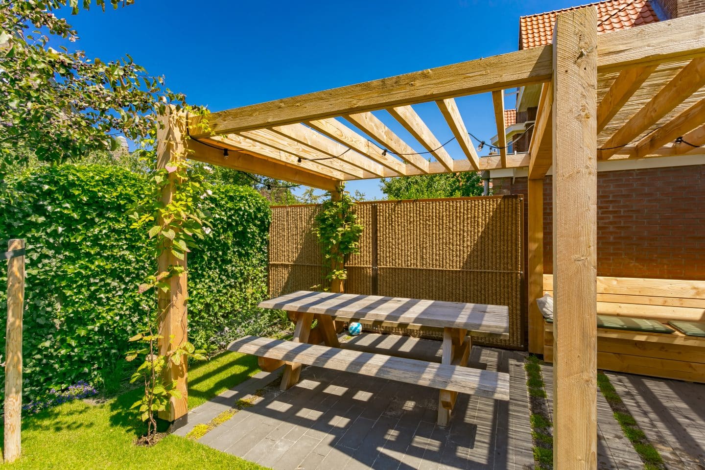 Een schommel mocht in deze familietuin niet ontbreken. Bij het ontwerp van ons tuintimmerwerk stond kindvriendelijkheid van deze tuin dan ook centraal. We ontwierpen en realiseerden een pergola voor aan de zijkant van het huis, met daarin een schommel. In de achtertuin realiseerden we ook een royale pergola met daarin zowel een picknicktafel als grote zitbank. Bijzonder aan de zithoek is het gebruik van verschillende materialen, waaronder een kokos achterwand die zorgt voor extra (geluids-) isolatie. Om de fietsen te kunnen stallen, maakten we een overkapping van hardhout. Fraai element is de stalen bloemenplaat op de voorzijde van het fietsenhok. Dit voegden we toe, om het geheel wat extra uitstraling en gezelligheid te geven. Aan de straatzijde plaatsen we een stevig tuinhek dat aan twee kanten te openen is.