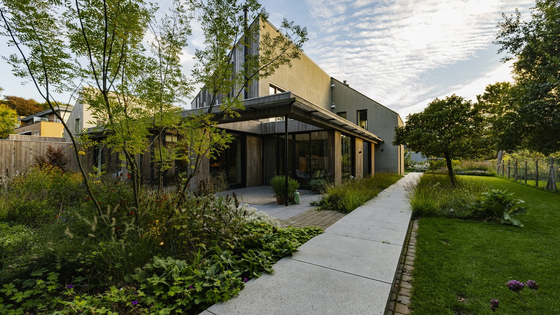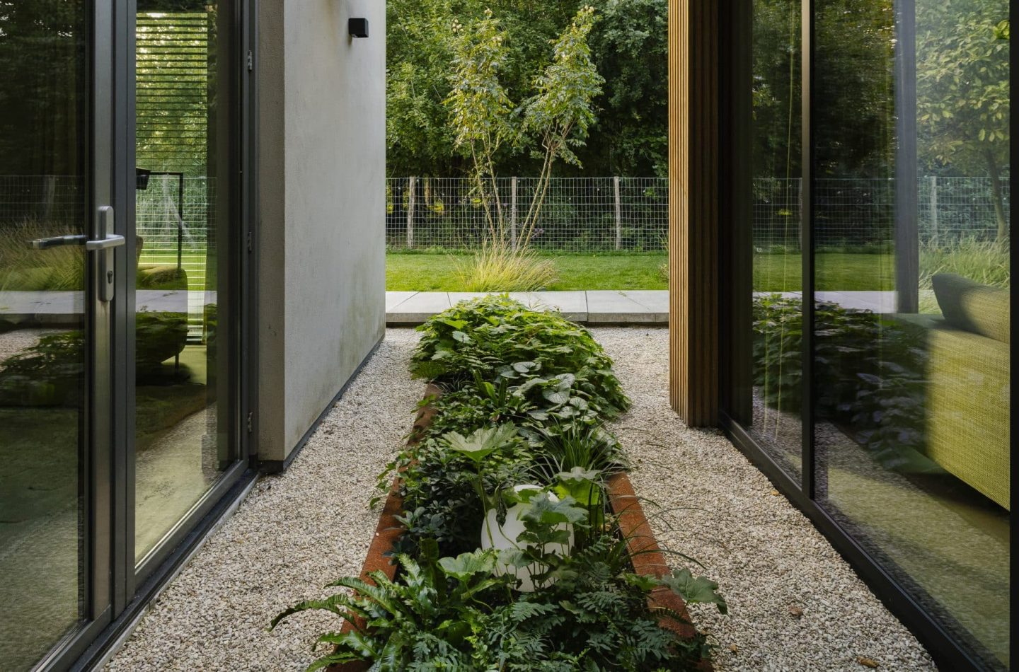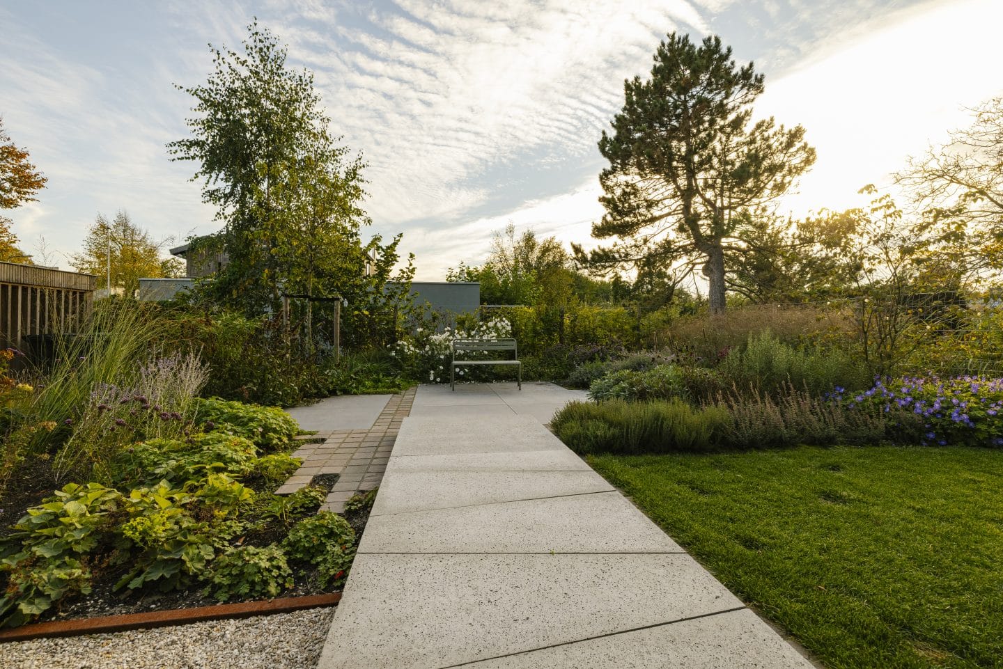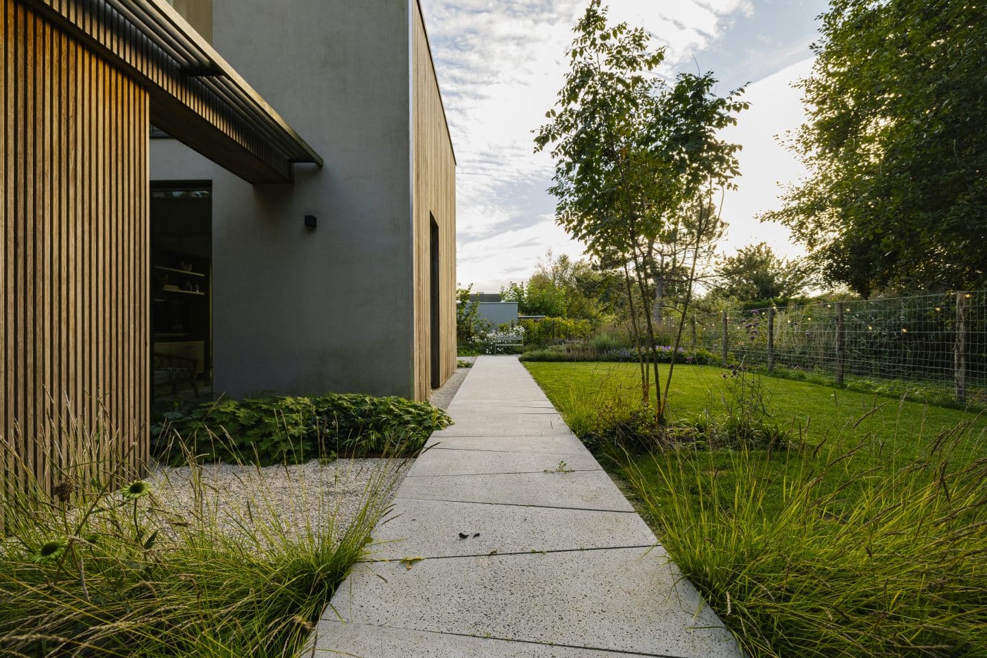De wens van de bewoners was om in de tuin zo min mogelijk bestrating te hebben, dit hebben we gedaan met een slimme mix van grote keramische tegels en kinderkoppen in een warme tint. De tegels vormen een baan rondom het huis en keren terug in de terrassen, wat zorgt voor rust en samenhang.