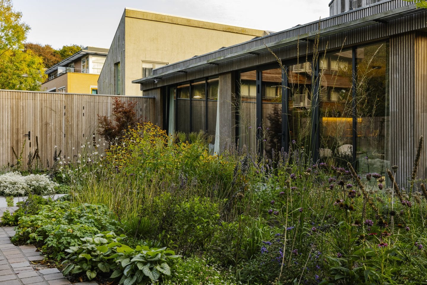 De bewoners graag een speelse, groene en gezellige tuin met een grasveld waar ruimte is voor een potje voetbal. We kozen voor een mix van vaste planten en rustige groene accenten in de vorm van siergrassen. We hebben de achtertuin opgebouwd in stroken, met centraal een royale border, met beplanting in verschillende soorten en hoogtes. Deze gelaagde opbouw geeft de tuin een levendig karakter en zorgt voor diepte en variatie door het jaar heen.