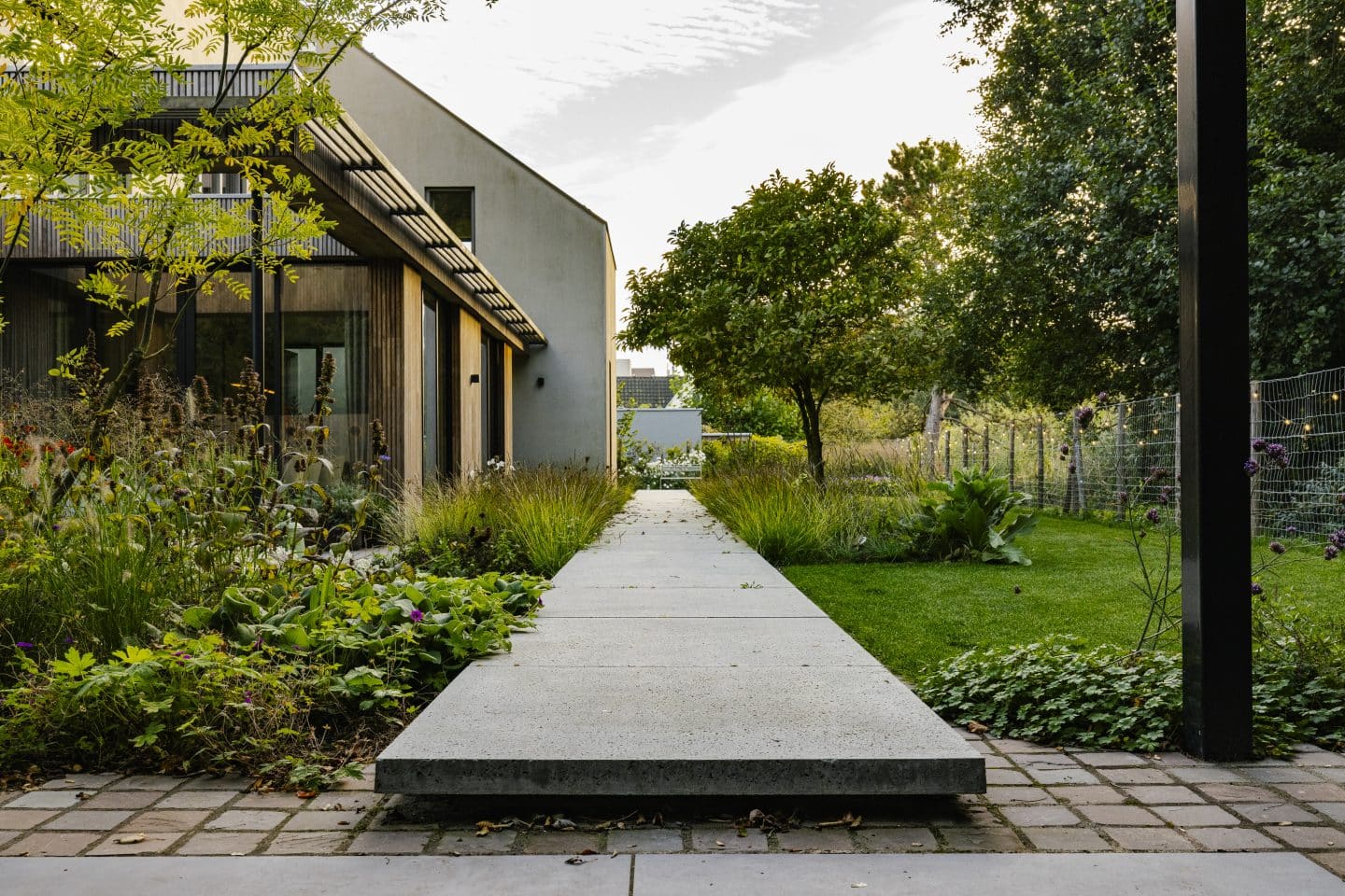 Langs de woning loopt een iets verhoogd pad, dat door een border met grassen leidt naar het voorterras. Zo ontstaat een visuele en functionele verbinding tussen voor- en achtertuin. Om de zichtlijnen te benadrukken in de tuin hebben we Schellevis trapeziumtegels gebruikt. Bij de entree komt deze zichtlijn terug, met trapeziumtegels die speels door het groen lopen naar de iets verhoogde voordeur.