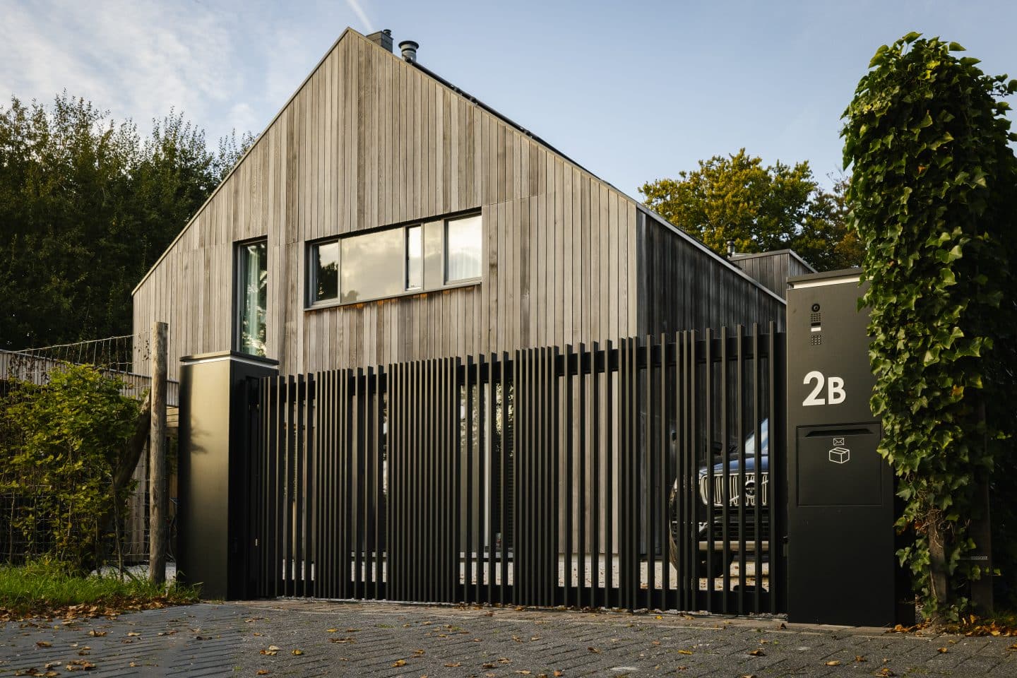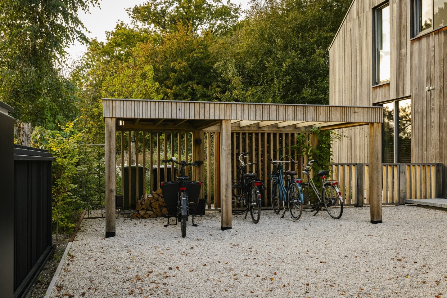 Om te voorkomen dat de jonge pup de oprit verlaat, is de oprit afgesloten met een op maat gemaakt automatisch hekwerk dat overgaat in de fietsenberging. De fietsenberging hebben we zelf ontworpen, gemaakt en de vergunning voor geregeld. De berging is gerealiseerd in eikenhout en vormt een combinatie van een pergola en berging, wat zorgt voor een groenere uitstraling.